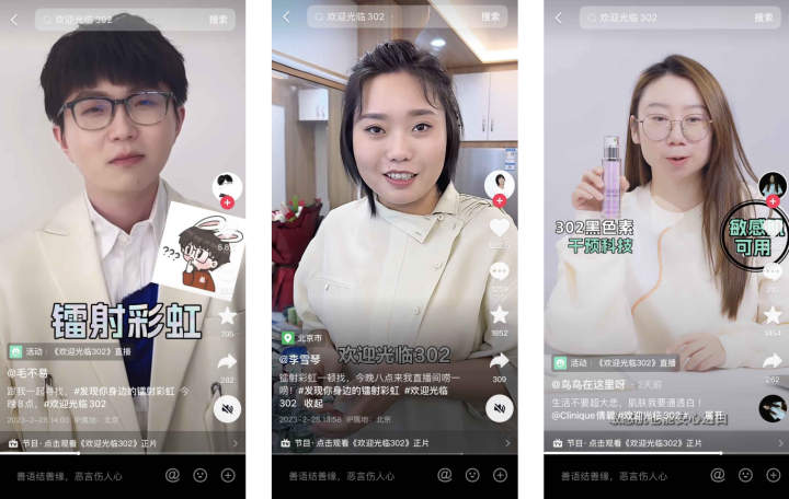 截至目前,活動收獲2億+曝光量、節(jié)目播放總量突破7800萬次,抖音話題#歡迎光臨302 收獲播放量1.3億+,引起廣泛熱議與共鳴。