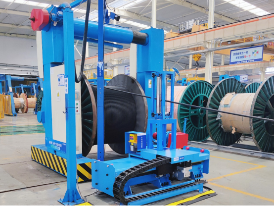 藍(lán)色自行小車把巨大的電纜軸送到既定位置,黃色的機(jī)械臂將線軸卡好,設(shè)備啟動(dòng)后線纜開始自動(dòng)纏繞,一盤整齊的電纜線慢慢成型。車間里,紅、黃、藍(lán)、白色的機(jī)械臂、自行小車等機(jī)械設(shè)備分工合作,有條不紊地生產(chǎn)。諾大的廠房中,零星行走著幾位身著藍(lán)色工裝、頭戴安全帽的工作人員。