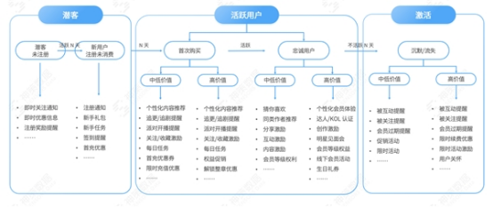 此外,文娛平臺可以基于人群偏好與用戶行為表現(xiàn),構(gòu)建一套精細化消息推送策略,比如從潛客到活躍到召回,每個階段推送不同的內(nèi)容及活動,例如潛客主要推送新手禮包、首次充值優(yōu)惠等;活躍用戶主要推送個性化內(nèi)容及互動激勵等;對于沉默用戶推送限時活動和用戶關(guān)懷等。