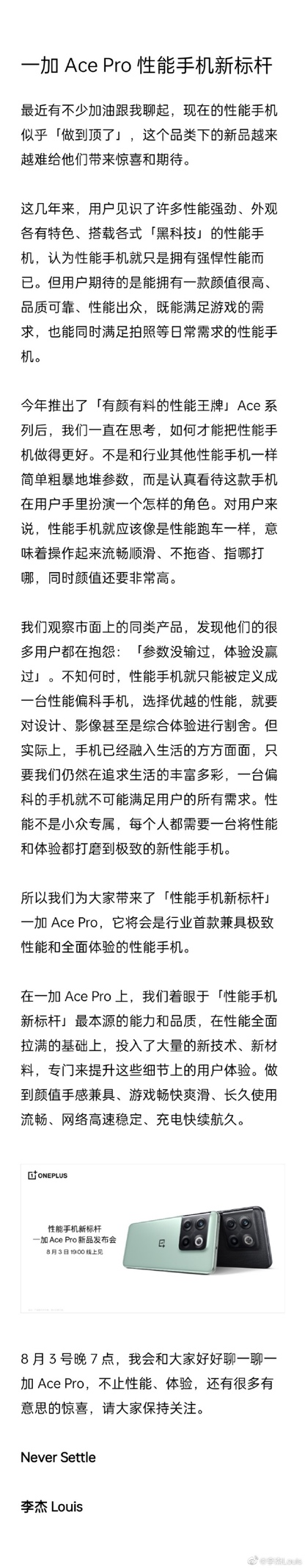 一加 Ace Pro定位“性能手機(jī)新標(biāo)桿”, 一加中國區(qū)總裁李杰表示不知何時,性能手機(jī)就只能被定義為一臺性能偏科手機(jī),選擇優(yōu)越的性能,就要對設(shè)計、影像甚至是綜合體驗進(jìn)行割舍。李杰稱:每個人都需要一臺將性能和體驗都打磨到極致的新性能手機(jī)。性能手機(jī)新標(biāo)桿一加 Ace Pro,將會是行業(yè)首款兼具極致性能和全面體驗的性能手機(jī)。