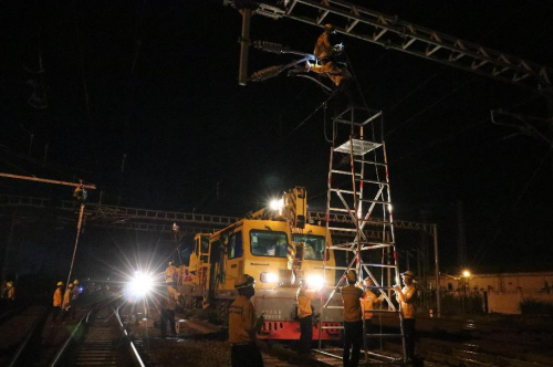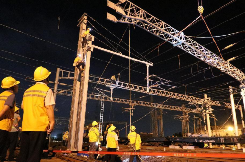 ??谡臼沁B接環(huán)島高鐵東西段、西環(huán)貨線和過海列車的樞紐車站,日常維修天窗時(shí)間只有60-120分鐘,施工天窗也在180分鐘內(nèi),對(duì)于更換跨越7條承導(dǎo)線索的硬橫梁是個(gè)不小的挑戰(zhàn),該段周密部署,從9月15日就進(jìn)入了緊張的更換??谡居矙M梁的過渡施工天窗作業(yè)中。
