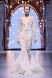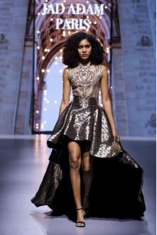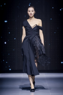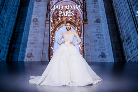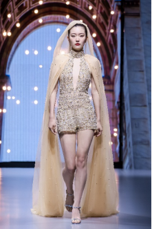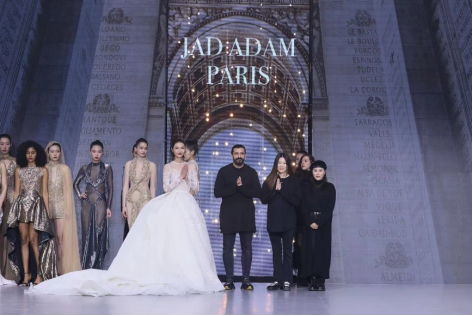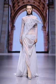 在充滿異域風情的“巴爾米拉女王”主題發(fā)布中,法國高定女裝設(shè)計師JadAdam攜手紹興永耀紡織品有限公司、紹興晶遠創(chuàng)意設(shè)計有限公司展現(xiàn)了尋找內(nèi)心平靜的啟蒙之旅的獨特過程。設(shè)計師從柯橋優(yōu)秀的面料中獲得啟發(fā),在華麗的禮服裙中采用了大量的刺繡及繡片繡珠工藝。兩家企業(yè)提供的閃光高密度歐根紗、銀色金屬絲、清透網(wǎng)眼等面料,花型立體簡潔、色彩透亮多變,為設(shè)計師帶來了豐富的靈感。從晚禮服、婚紗到高級時裝,JadAdam通過特有的藝術(shù)表現(xiàn)手法詮釋了本次禮服設(shè)計。