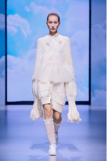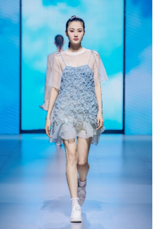 在“童年”主題秀演中,法國設(shè)計師聯(lián)袂浙江懿紗紡織科技有限公司、紹興柯橋豐旺紡織品有限公司,圍繞兒童的藝術(shù)、回到學校、童年的回憶三個子主題,共同演繹了童年的懷舊故事。設(shè)計師以精細的絎縫、印染、明線縫紉及自然著色的效果制作服裝和圖案,在工藝上采用了法國特有的編織技術(shù),并結(jié)合WALTZ系列花紗、三醋酸、錦滌歐根紗、六角硬網(wǎng)等面料輕薄有型、色彩飽滿的特色,最大程度實現(xiàn)了紡織工藝的價值化。特別是在傳統(tǒng)手工藝非遺、生態(tài)環(huán)保材料等系列元素的加持下,為整場秀演增添了可持續(xù)時尚的價值。
