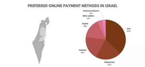 以色列主要的支付方式包括Visa、MasterCard,Isracard(以色列本土支付方式),Paypal、Other Wallets和American Express。卡支付在以色列非常流行,TOP100的零售商中,84%提供信用卡支付,69%提供電子錢包支付,Visa和萬事達信用卡是當(dāng)?shù)刈钍軞g迎的付款方式。