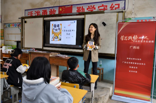 4月25日下午,“學(xué)思踐悟二十大 投教服務(wù)校園行”在浦北縣三合鎮(zhèn)橋頭小學(xué)開(kāi)展。深交所、海通證券投教基地的專(zhuān)業(yè)人員深入各個(gè)班級(jí)進(jìn)行少兒財(cái)商授課,借助由深交所投資者服務(wù)部編著的《漫話大股市》,將專(zhuān)業(yè)的財(cái)經(jīng)內(nèi)容以通俗易懂的圖文形式傳授給小朋友們?!肮镜降资鞘裁?”“公司上市又是什么?”“有限責(zé)任公司與股份有限公司的區(qū)別在哪?”……一顆顆財(cái)商的種子在孩子們的心中生根發(fā)芽。