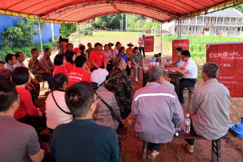 4月26日下午,活動(dòng)一行人走進(jìn)了浦北縣柑子根村第一黨支部。在柑子根村中心一片碧綠的田野上,擺放著整齊的板凳桌椅,村民代表相圍而坐,共同學(xué)習(xí)了一堂別開(kāi)生面的“田間黨課”。