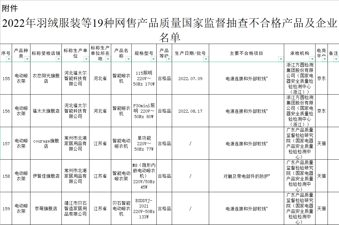 近日,市場監(jiān)管總局通報(bào)了2022年羽絨服、電動(dòng)晾衣架等19種網(wǎng)售產(chǎn)品質(zhì)量國家監(jiān)督抽查情況。結(jié)果顯示,2022年度電動(dòng)晾衣架抽查不合格率高達(dá)46.2%,為19種抽查產(chǎn)品中最高。