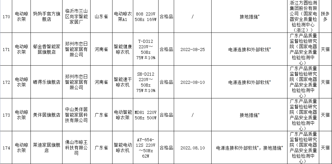 本次電動(dòng)晾衣架抽查檢驗(yàn)9個(gè)省(市)48家企業(yè)生產(chǎn)的52批次產(chǎn)品,包括天貓、京東、拼多多、抖音等電子商務(wù)平臺,發(fā)現(xiàn)24批次產(chǎn)品不合格,涉及卡瑞琪(courage)、顧家、格峰、盼盼、歐蘭特等品牌。